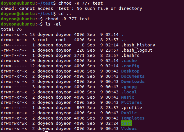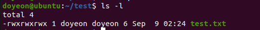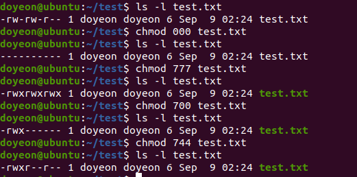 ex) chmod -R 777 test => test 폴더 내의 모든 권한을 rwxrwxrwx로 설정한다.