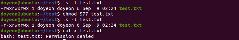 chmod 577로 사용자에게 쓰기 권한만 없앴을 때 파일 내용을 작성하려 할때 Permission denied가 뜨는 것을 볼 수 있다.