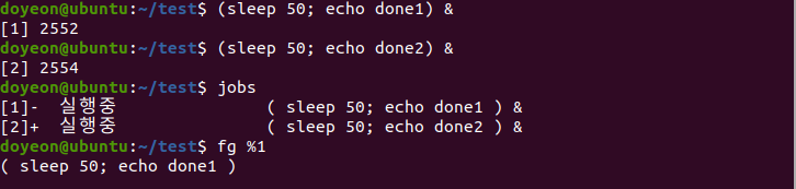 fg %작업번호를 하면 background에서 실행되고 있는 작업번호에 해당되는 작업을 foreground로 돌릴 수 있다.