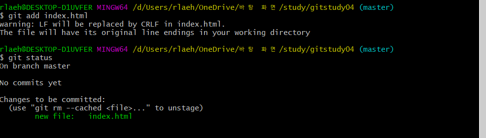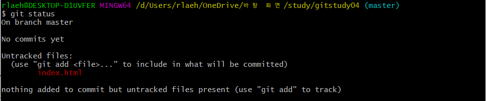 새 파일이 추가되면 git은 변화된 상태를 감지한다. Untracked files목록으로 working directory에 생성된 새로운 파일을 확인할 수 있다.