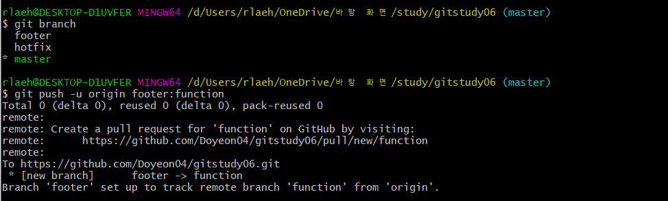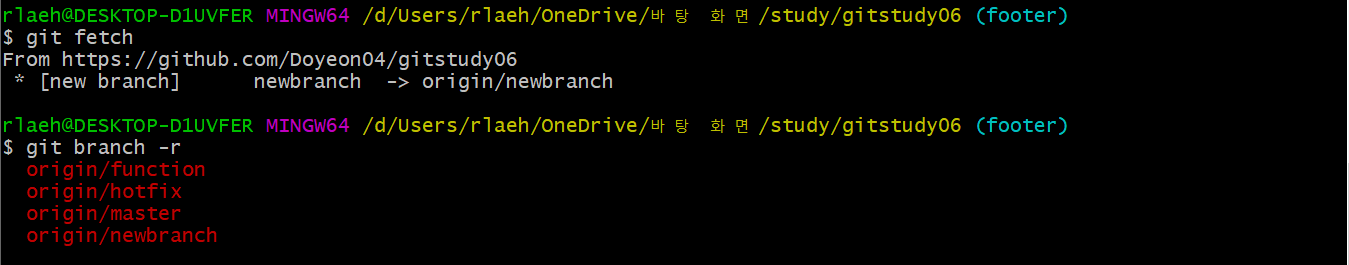 원본 local repository에서 footer 브랜치를 funciton remote branch로 등록한다.