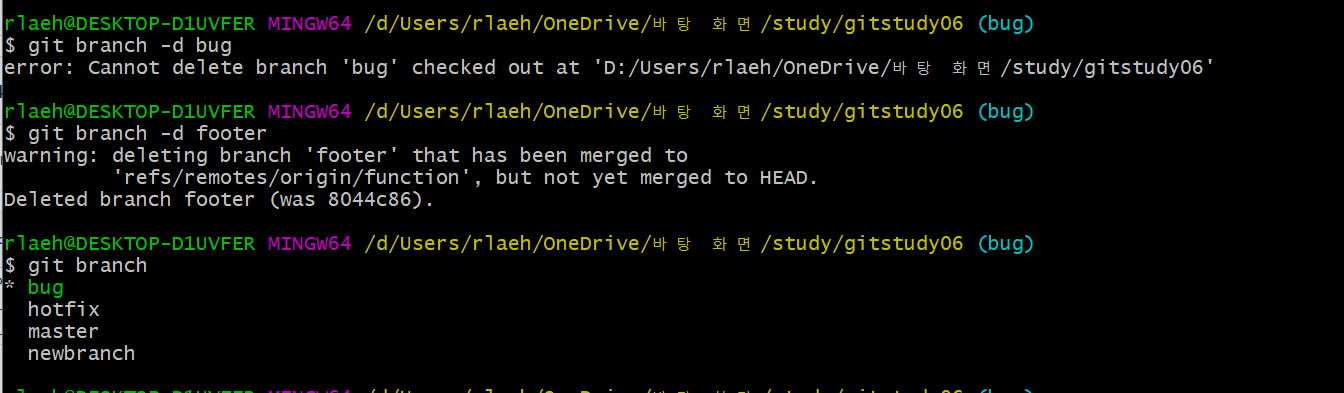현재 브랜치에서는 삭제할 수 없고 다른 브랜치로 이동 후 삭제해야한다.