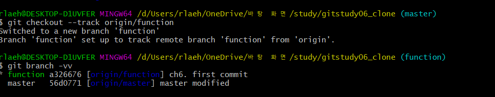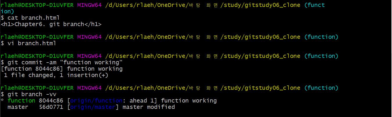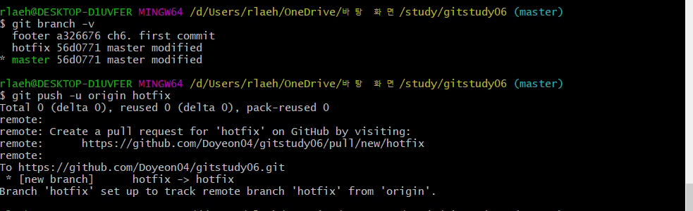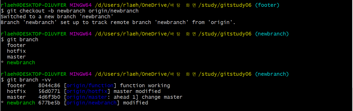 gitstudy06 폴더로 footer 브랜치에서 pull한다. 그럼 clone폴더에서 추가한 두번째 줄이 추가가 된 것을 볼 수 있다.