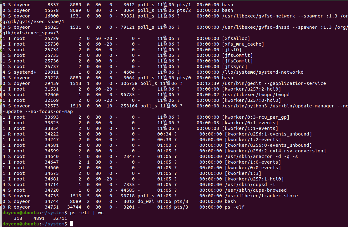 이 때 pid가 1번인 프로세스는 주기억장치상에서 처음에 부팅할때 수작업으로 만든 init프로세스이다.