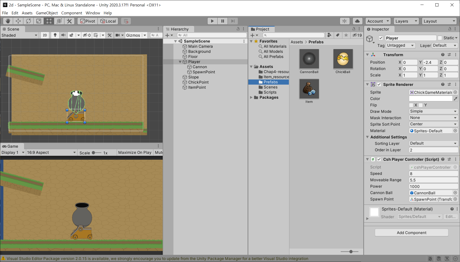 Player객체의 스크립트에 Cannon Ball에는 프리팹으로 등록한 CannonBall을, Spawn Point에는 만들어 놓은 Spawn Point를 각각 드래그한다.