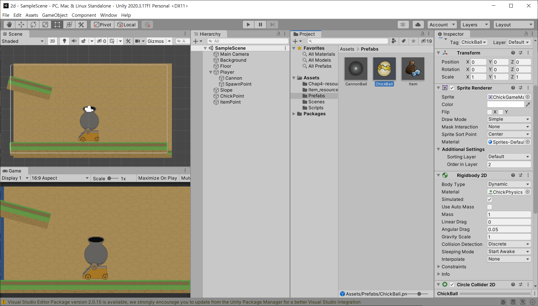 chickBall 을 Prefab으로 등록한다. order in layer는 2로 두어 가장 앞쪽으로 올 수 있게 한다.