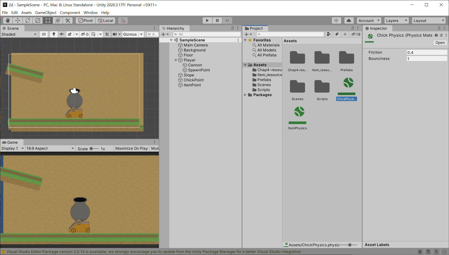 이름을 ChickPhysics로 변경 후 Friction과 Bounciness를 수정한다.