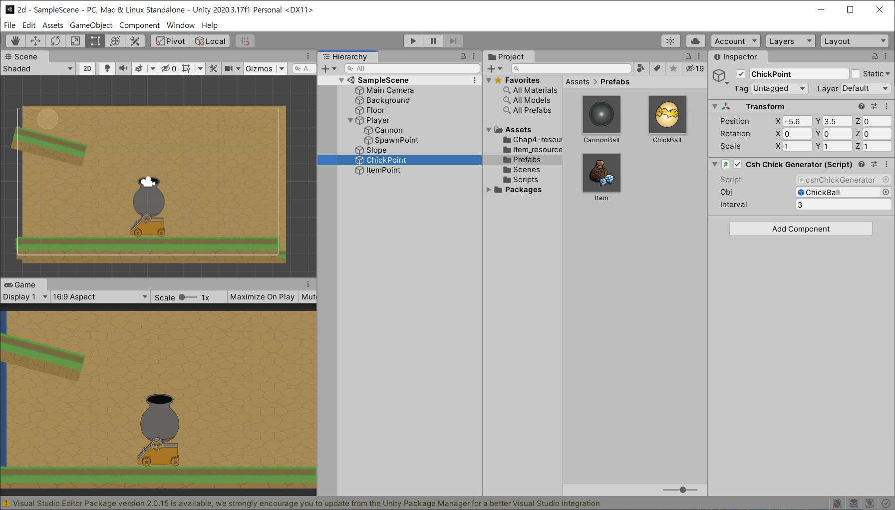 빈 오브젝트인 ChickPoint도 position을 설정해 생성하고, chickGenerator 스크립트를 ChickPoint에다 추가한다.