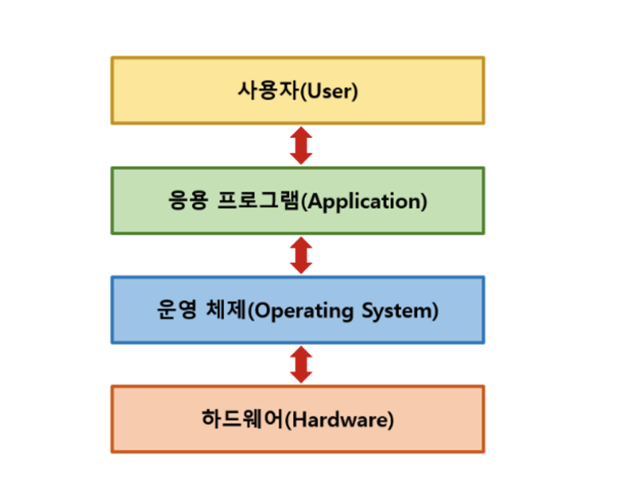 - 응용 프로그램과 하드웨어 사이에서 응용 프로그램에 필요한 자원 할당, 올바르게 실행되도록 관리