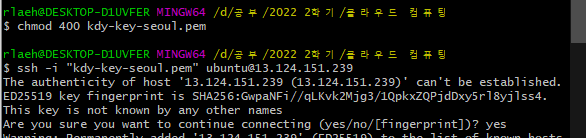 Git Bash를 실행해 키 페어 파일이 있는 디렉토리로 가서 아래 명령어들을 실행해 접속한다.
