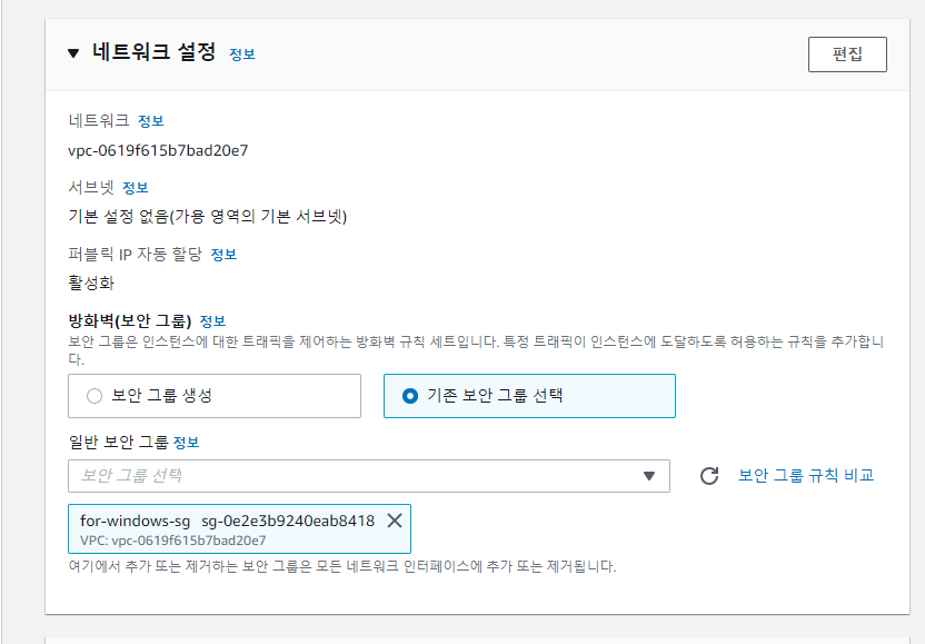 vpc는 기본 vpc로 하고 인바운드 규칙을 RDP, Anywhere-IPv4 로 설정후 보안 그룹 생성 클릭