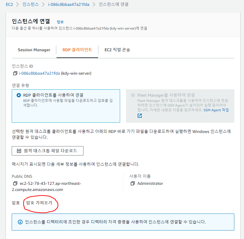 사용자 이름은 Administrator, 암호는 암호 가져오기를 클릭