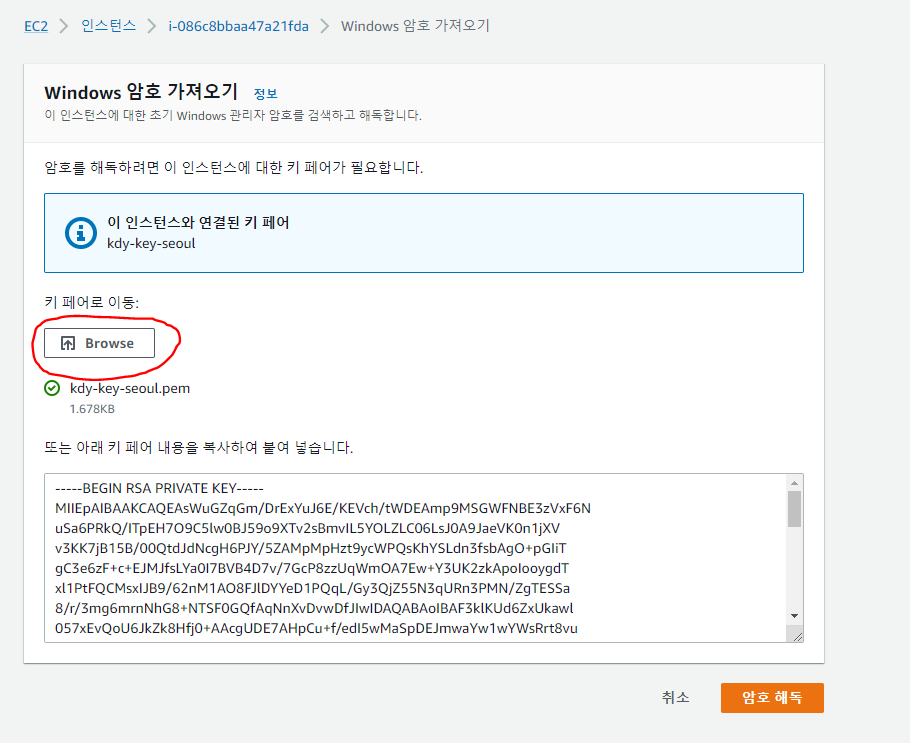인스턴스와 연결된 키 페어를 입력하고 암호 해독 버튼을 클릭하면
