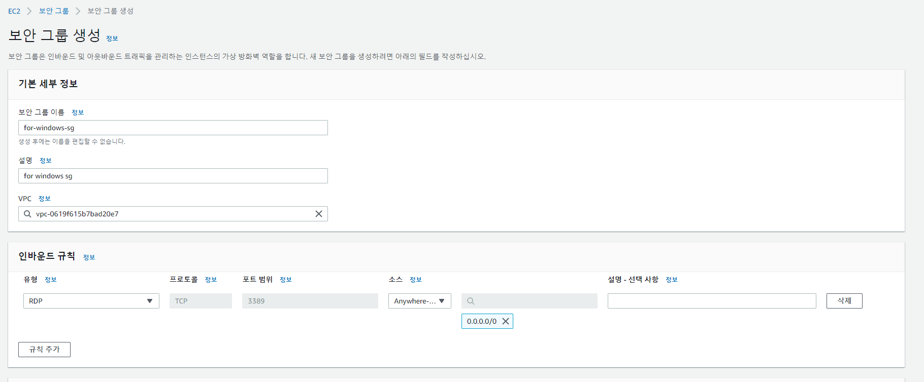 보안 그룹 이름과 설명 추가