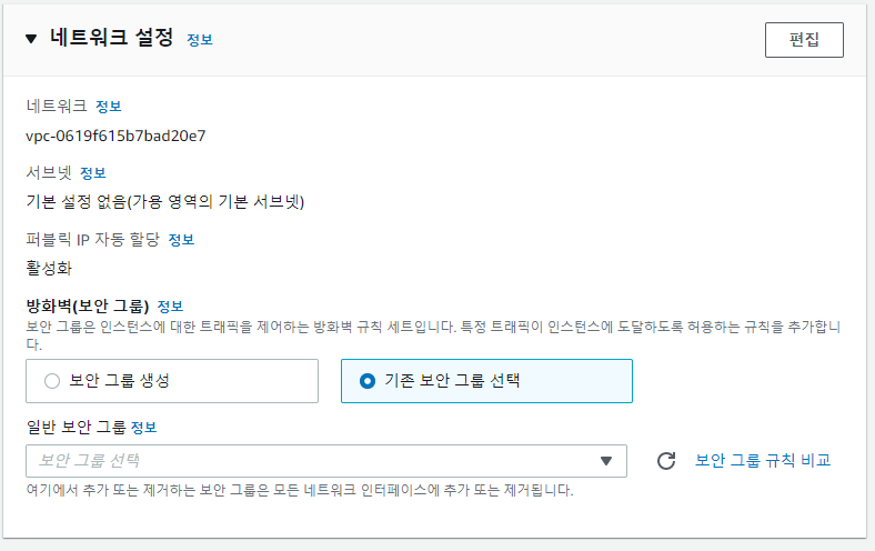 기존 보안 그룹을 선택하고 선택할 보안 그룹을 생성한다.