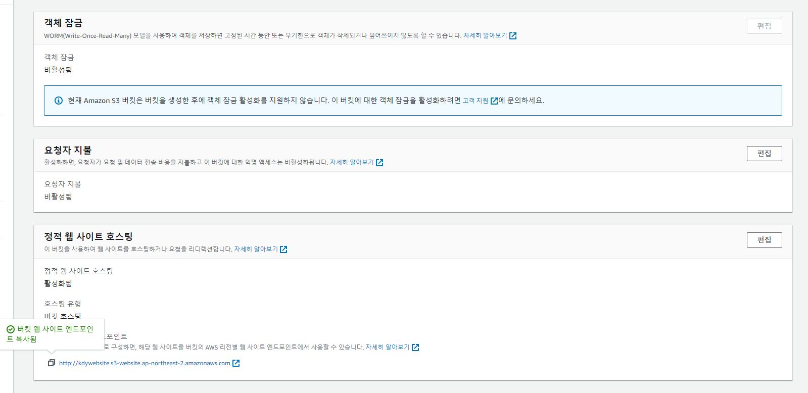 정적 웹사이트 호스팅 - 버킷 웹사이트 엔드 포인트