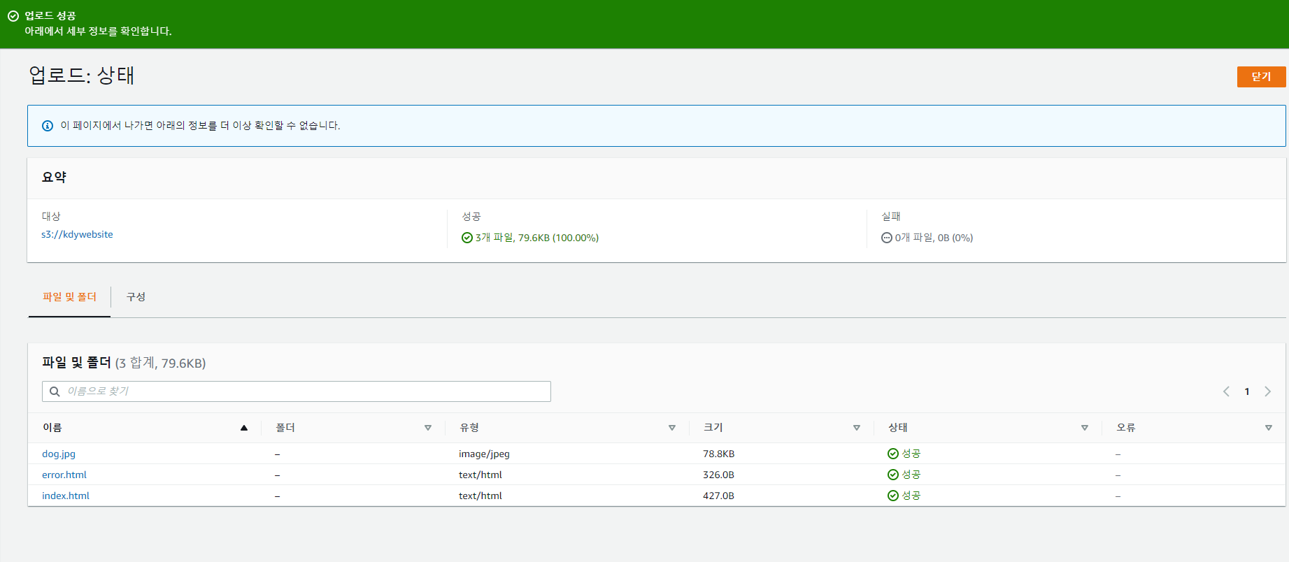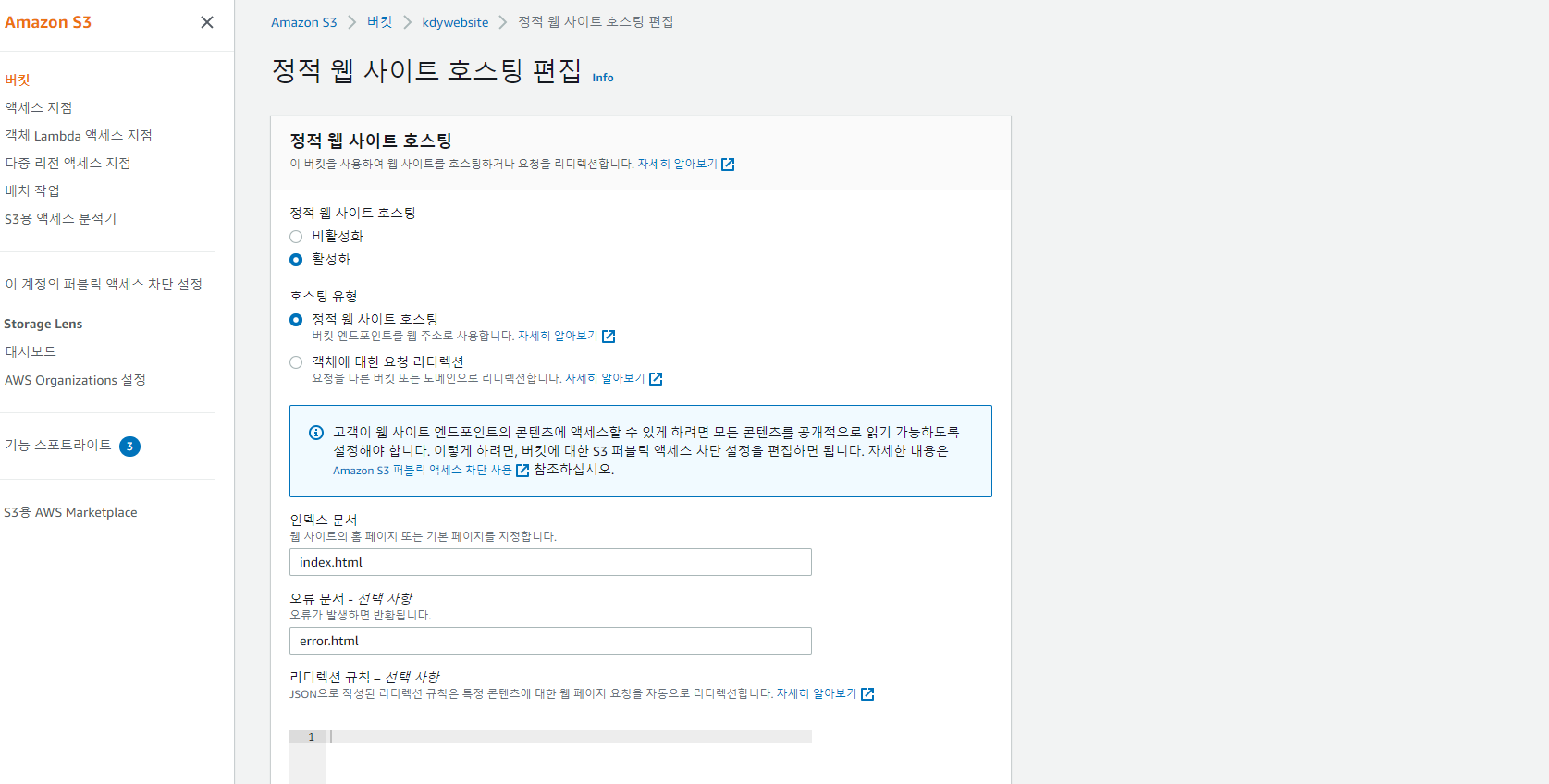 정적 웹사이트 호스팅 활성화