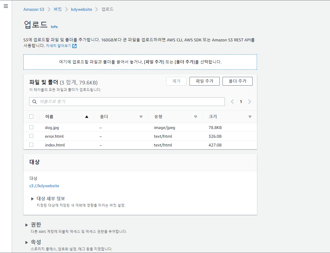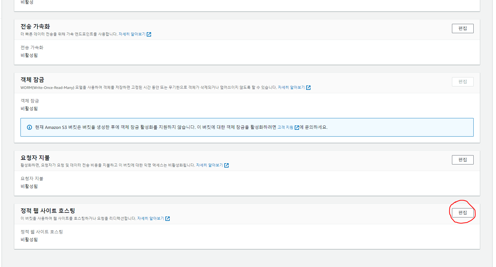 버킷 - 속성 - 정적 웹사이트 호스팅 편집 클릭