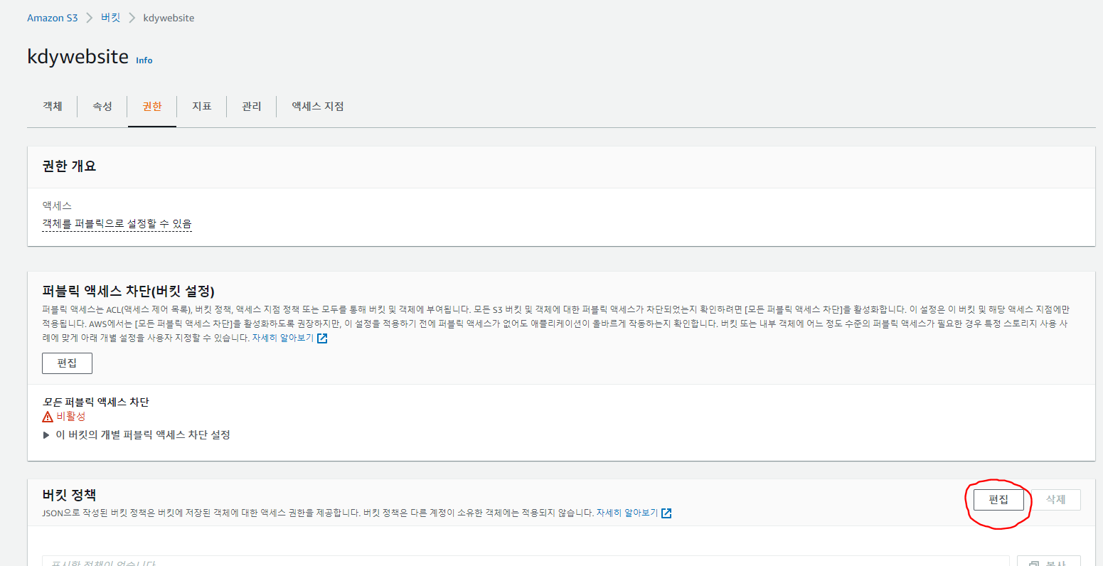 버킷-권한-버킷 정책 편집 클릭