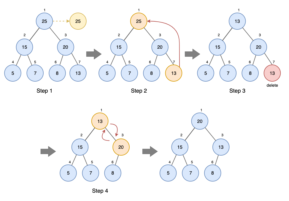4. 힙 속성이 유지될 때까지 3번 과정을 반복한다.