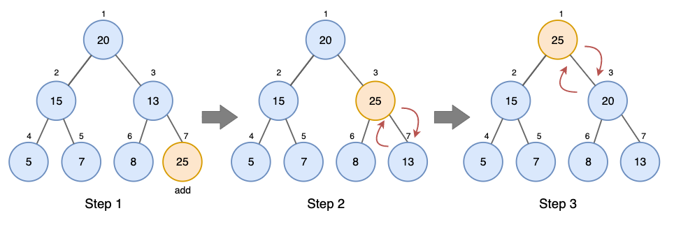 2. 부모 노드와 비교하여 부모 노드보다 새로운 노드가 크다면 서로 교환한다.