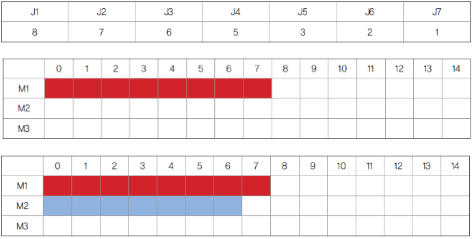 맨 위의 표는 각 작업의 기계 사용 시간이다. 미리 정렬되어 있다고 가정한다.