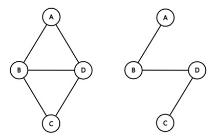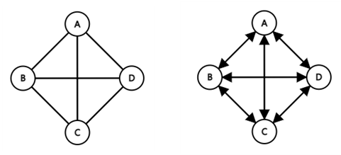정점 A와 B를 연결하는 간선은 (A, B)와 같이 정점의 쌍으로 표현한다. (A, B)와 (B, A)는 동일한 간선이 된다.