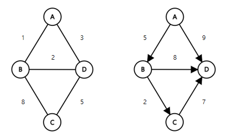방향 그래프에서 <A,B>와 <B,A>는 서로 다른 간선이다.