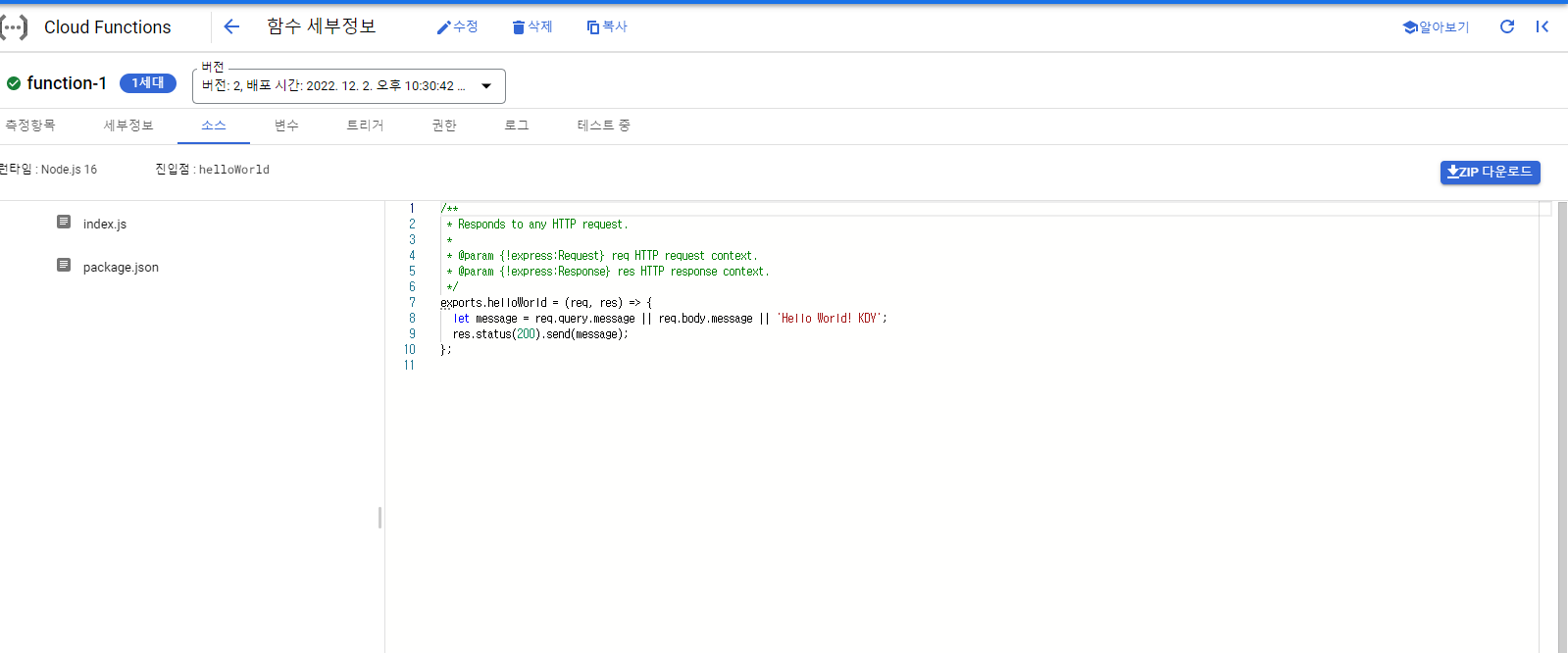 함수 테스트를 해보면 Hello World 가 뜬다.