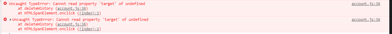 수입과 지출 내역만을 보여주는 함수에서 html 태그에 delBtn을 넣어줘서 버튼을 누르면 전체 내역에서도 삭제가 되는걸 구현해보고 싶었으나 삭제 버튼을 누르면 이런 에러가 떴다.