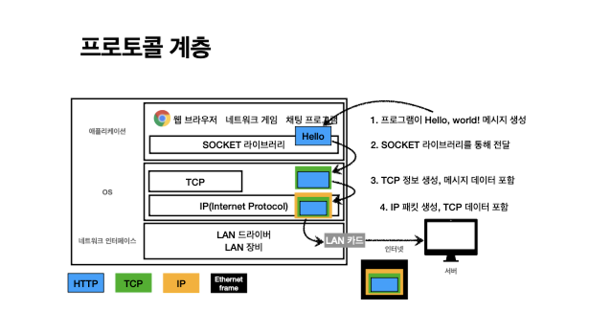 3. OS 계층에서 메세지 데이터 바깥에 TCP 정보를 감싸 생성, 그 바깥에 IP 패킷 생성