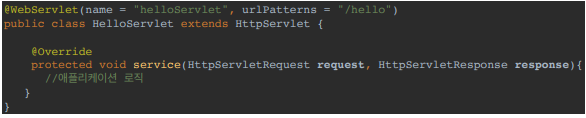 urlPatterns(/hello)의 URL이 호출되면 서블릿 코드가 실행된다.