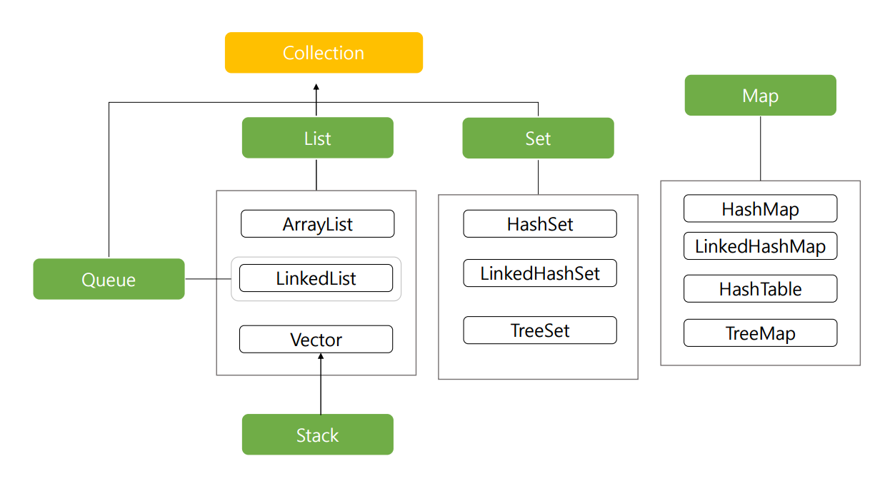 컬렉션의 특성에 따라 크게 List, Set, Map으로 나눌 수 있고 메모리의 입출력 특성에 따라 기존 컬렉션 기능을 확장한 Stack, Queue가 있다.