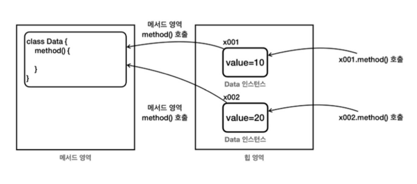 같은 클래스에서 생성된 객체여도 인스턴스 내부의 변수 값은 다를 수 있지만 메서드는 공통된 영역을 공유한다.