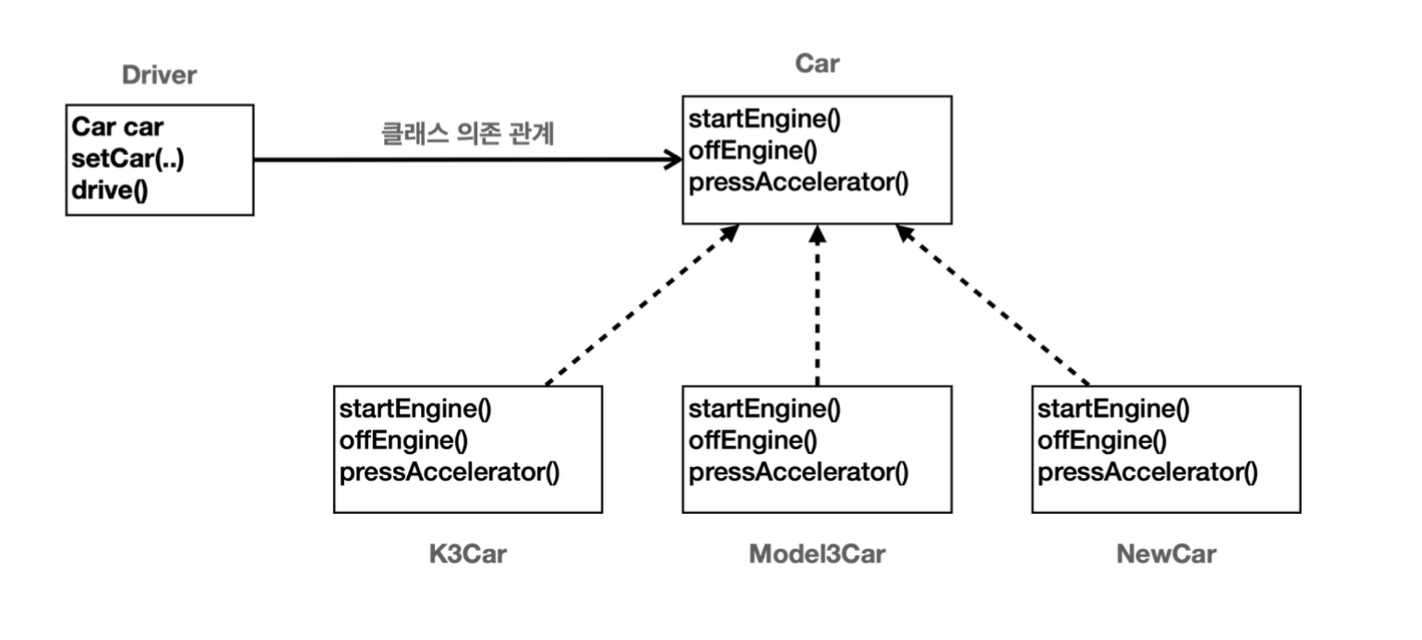 운전자는 자동차 인터페이스만 참조해 자동차 역할에만 의존한다.
