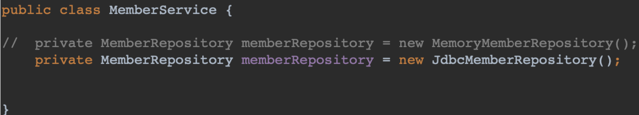 문제점 - 이 때 클라이언트인 MemberService의 코드를 바꿔야 한다. 다형성을 사용하지만 OCP를 못지켰다.