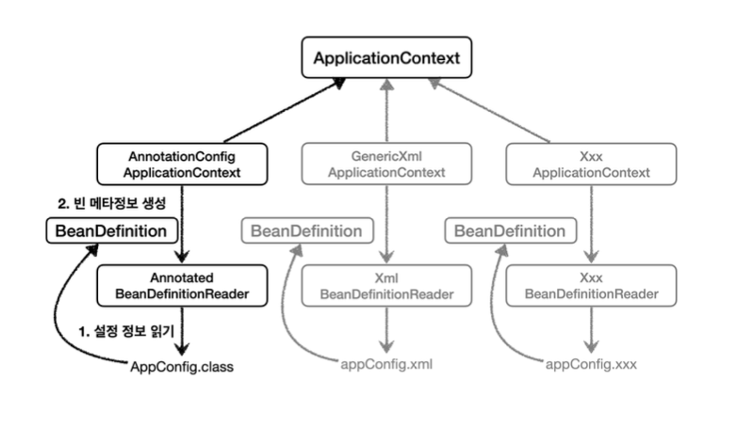 스프링 컨테이너는 xml or 애노테이션 기반의 자바 설정 클래스(AppConfig)로 생성 가능