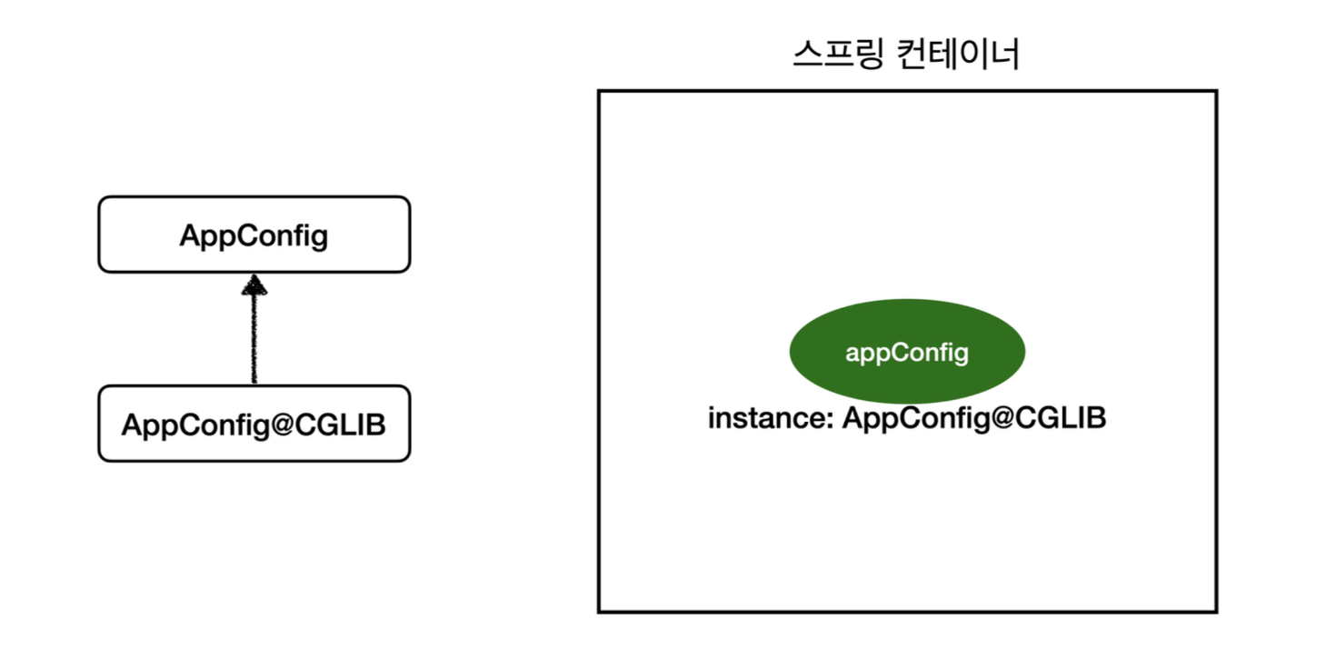 AppConfig 클래스를 상속받은 임의의 다른 클래스를 만들고, 그 다른 클래스를 스프링 빈으로 등록한다.