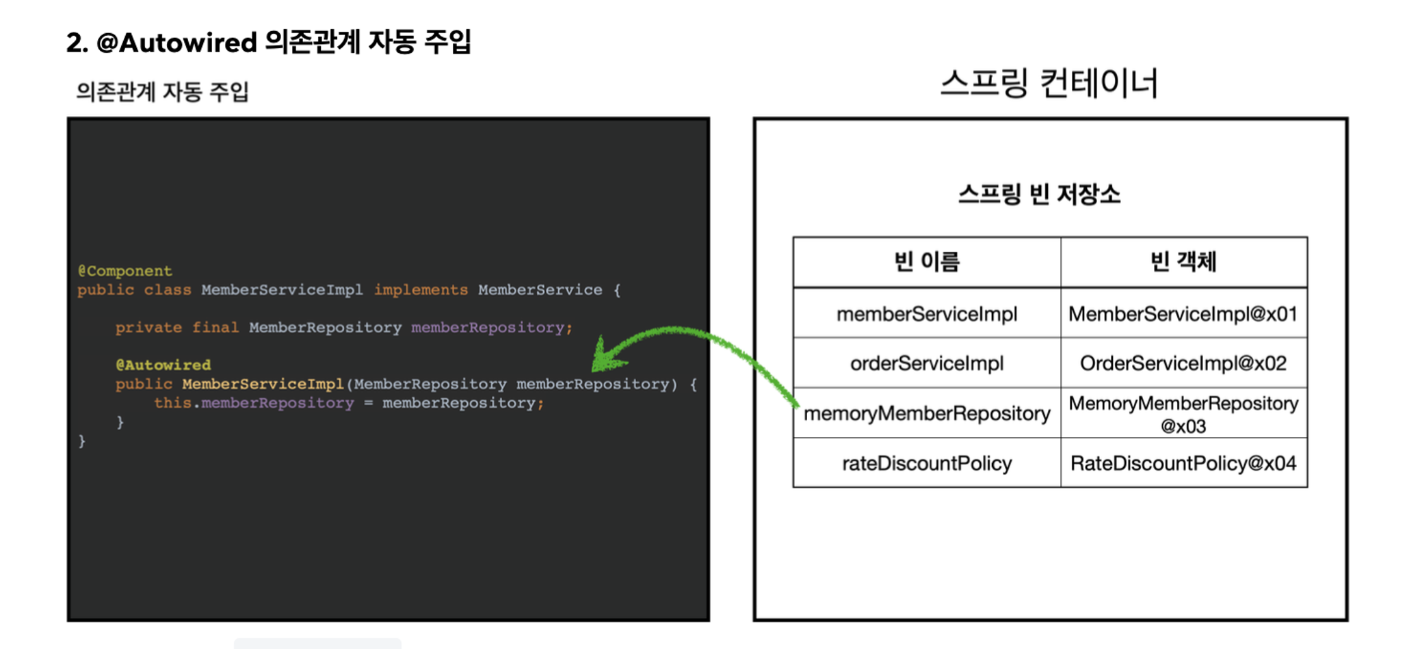 생성자에 @Autowired를 사용해 생성자의 매개변수 타입에 맞는 빈 객체를 스프링이 찾아 자동으로 주입해준다.