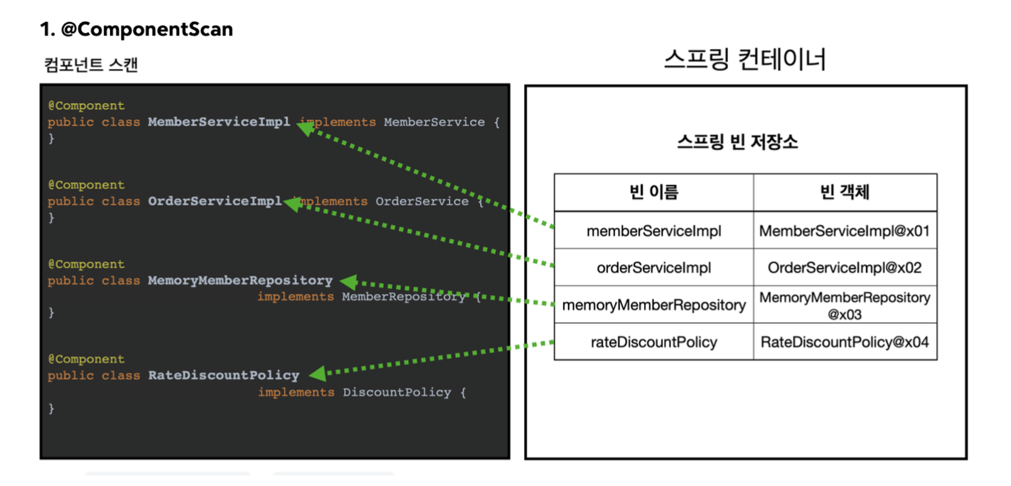 1. @ComponentScan은 @Component가 붙은 모든 클래스를 스프링 빈으로 등록한다.