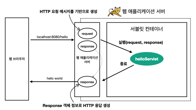 - 서블릿 컨테이너에서 request, response 객체를 파라미터로 하여 서블릿 객체를 호출한다.