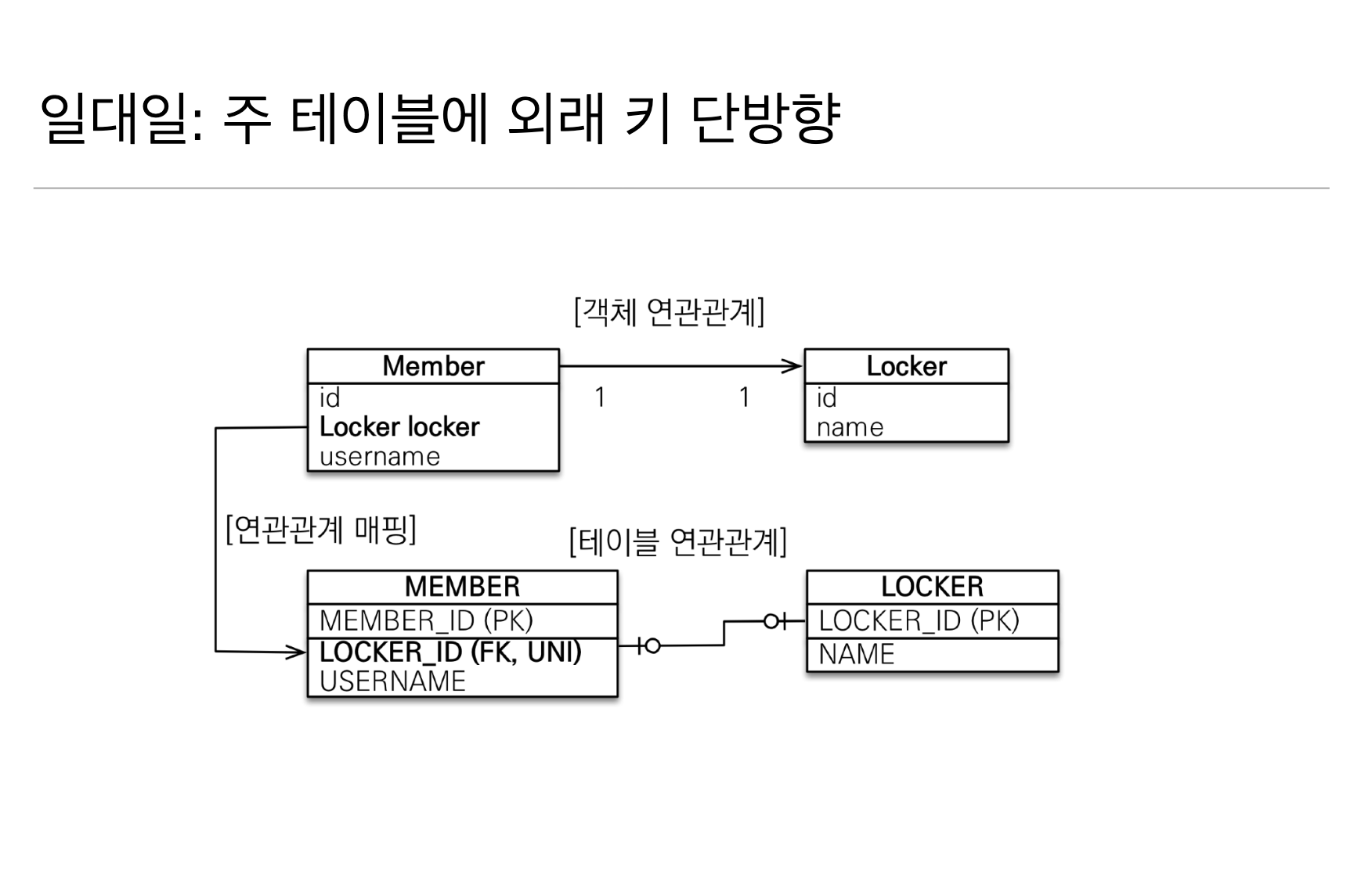 테이블에서는 무조건 다쪽에 외래키가 들어가야되는데, 객체에서는 일에 외래키를 가지고 싶을 수도 있다.