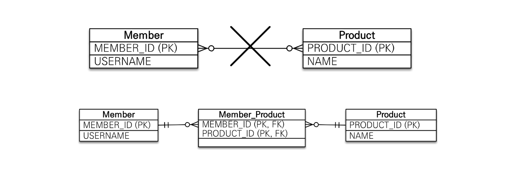 관계형 데이터베이스는 정규화된 테이블 2개로 다대다 관계를 표현할 수 없기 때문에