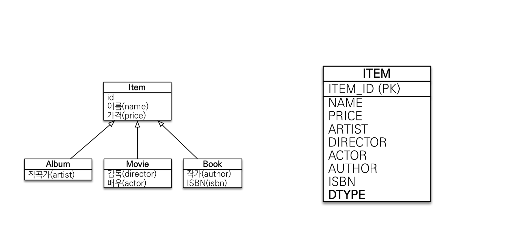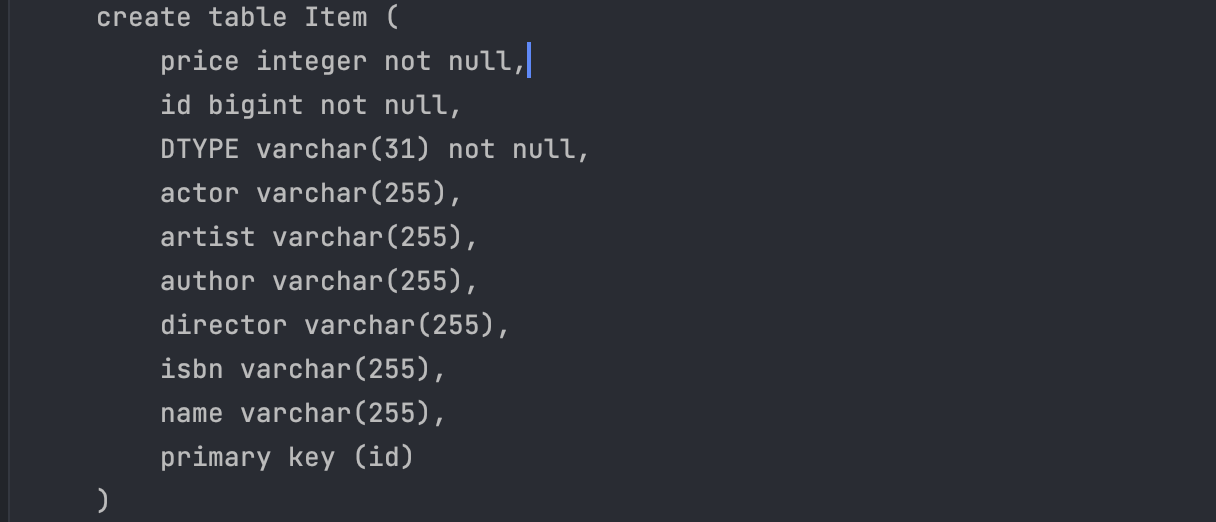 ITEM의 필드들을 가지고 있는 ALBUM, MOVIE, BOOK 테이블만 생성된다.
