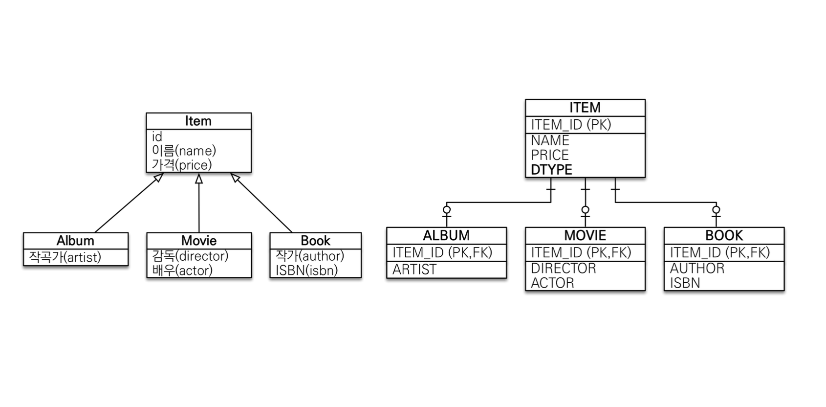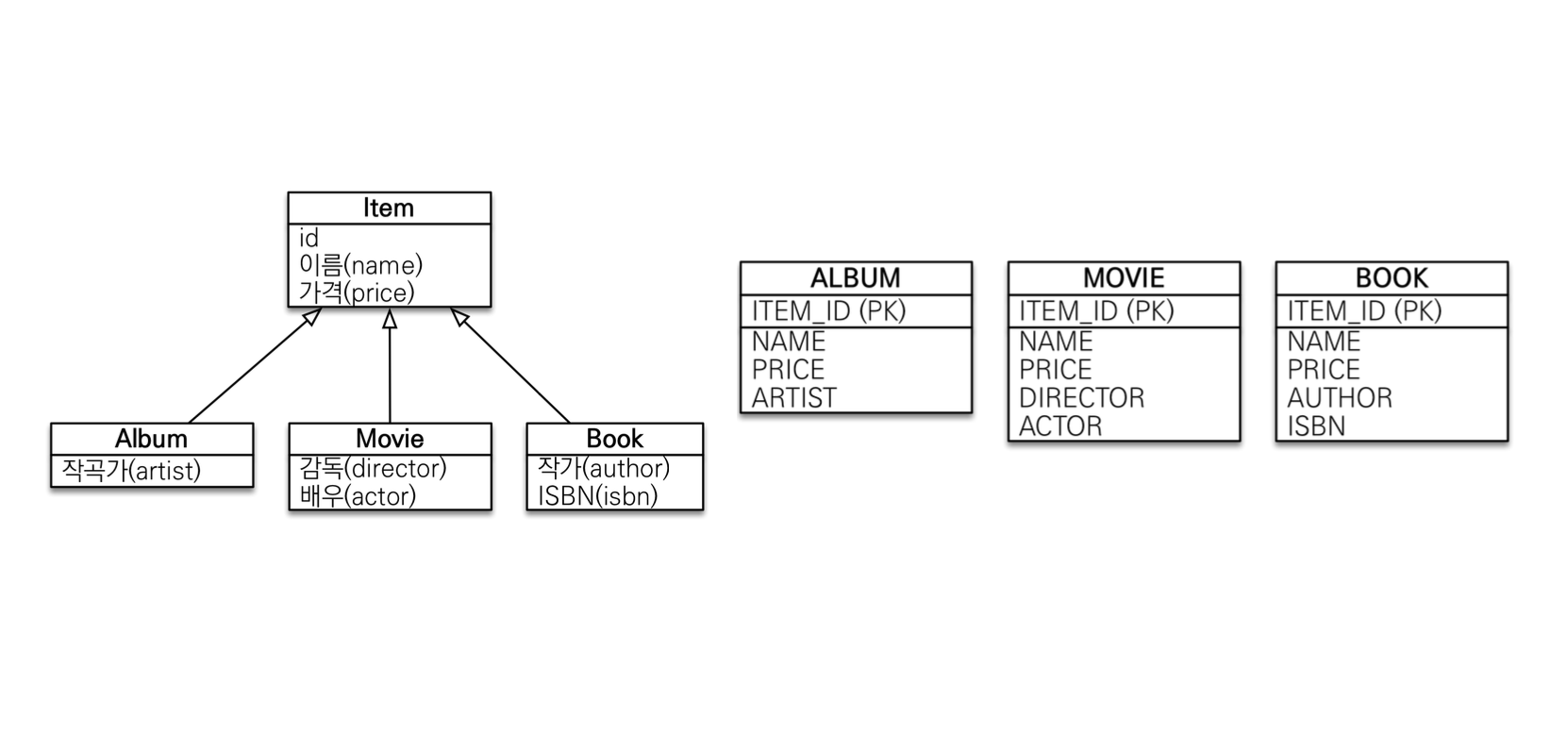 ITEM의 필드들을 가지고 있는 ALBUM, MOVIE, BOOK 테이블만 생성된다.