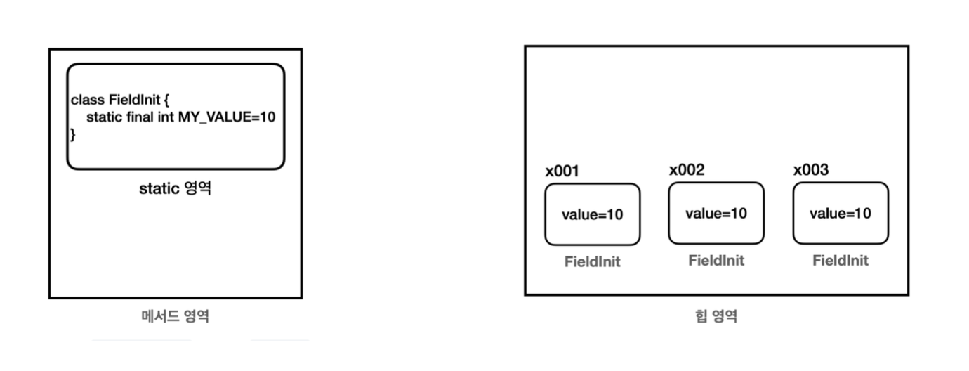 자바 메모리 구조 메서드 영역: 클래스 정보 보관스택 영역: 실제 프로그램이 실행되는 영역힙 영역: 객체(인스턴스가 생성되는 영역) (new 키워드) 메서드 영역클래스 정보를 보관하는 영역 클래스 정보 - 클래스, 메서드 등의 실행 코드 static 영역 - static 변수 보관상수 풀 - 상수 관리 스택 영역실제 프로그램이 실행되는 영역 지역 변수, 중간 연산 결과, 메서드 호출 정보 등 힙 영역인스턴스가 생성되는 영역 객체 배열가비지 컬렉션이 이뤄지는 영역 같은 클래스에서 생성된 객체여도 인스턴스 내부 변수 값은 다를 수 있지만 메서드는 공통된 영역을 공유한다.따라서 메서드는 메서드 영역에서 공통으로 관리되고 실행된다. 멤버 변수(필드)의 종류 인스턴스 변수static이 붙지 않은 멤버 변수인스턴..