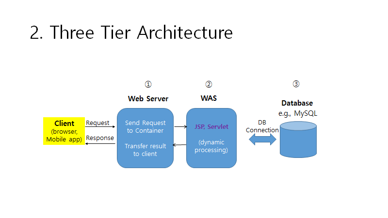 2. WAS에서는 JSP, Servlet을 수행해 동적인 처리를 한다.