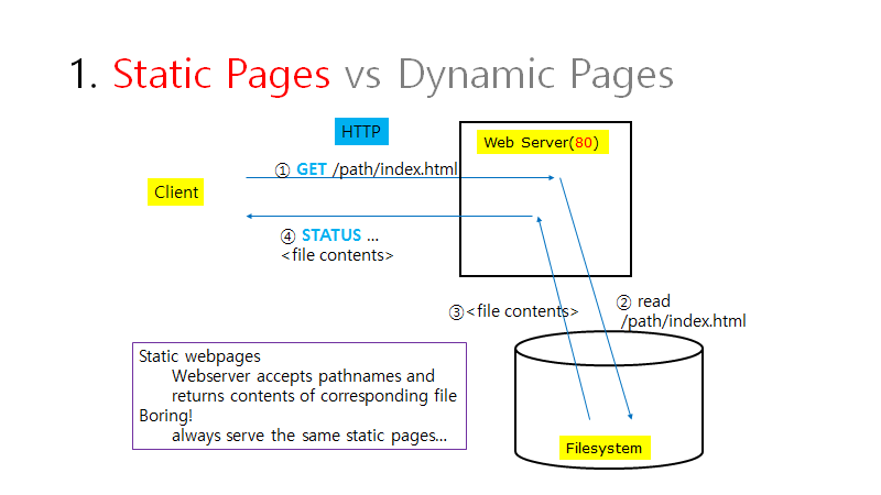 2. 웹 서버가 요청을 받고 FileSystem에서 읽어 들여 client에 던져준다.