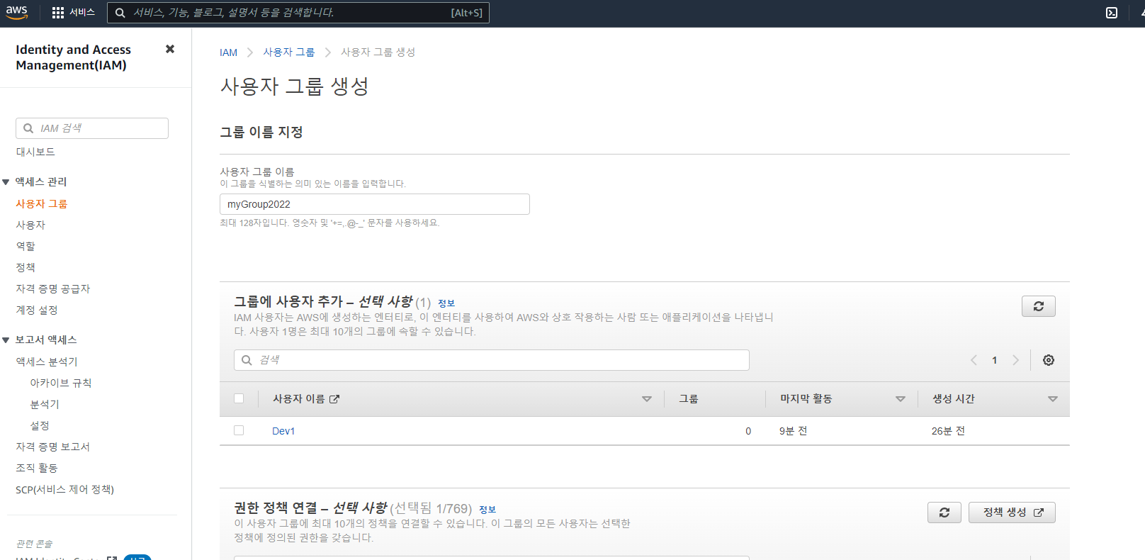 IAM 계정으로 로그인 후 IAM -> 사용자 그룹 -> 그룹 생성