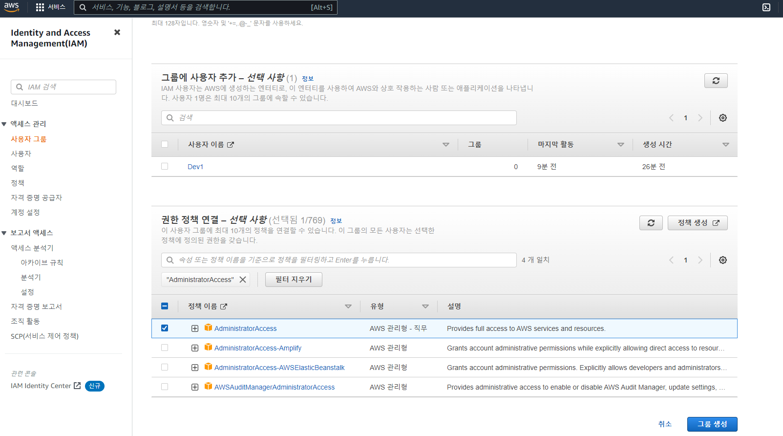 그룹 이름 지정 후 권한 정책 AdministratorAccess 선택